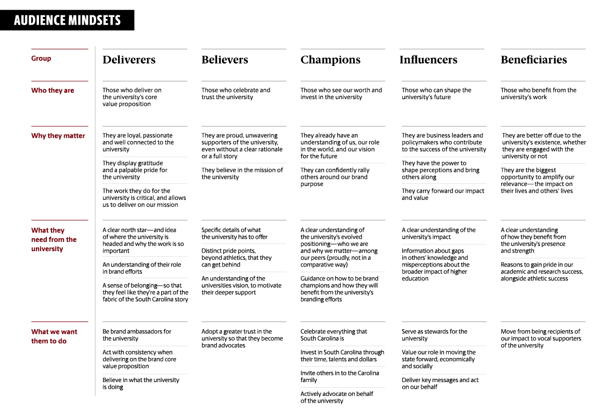 If you have identified your audience in the traditional audience segmentation (alumni, students, faculty, etc.), take it a step deeper to get to the mindset. Ask yourself about your audience's level of engagement with the university, what that engagement is based on (athletics? academics? other?) and how it might be taken further.