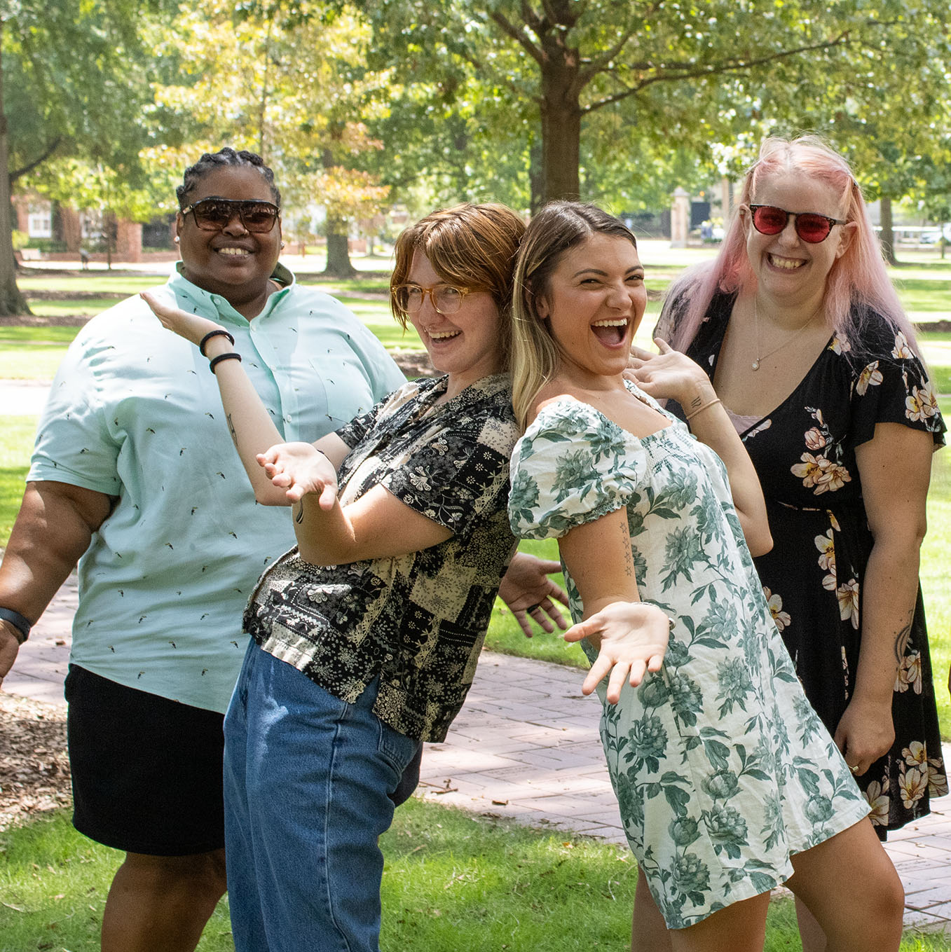 Alt Text: Four students pose on the shady horseshoe, with the two students in the front throwing their hands up.