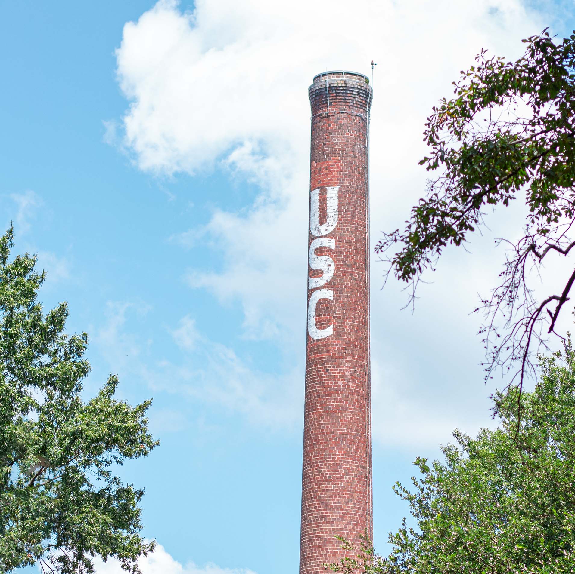 Alt Text: The USC smoke stack stands tall before the bright blue, partly cloudy sky.