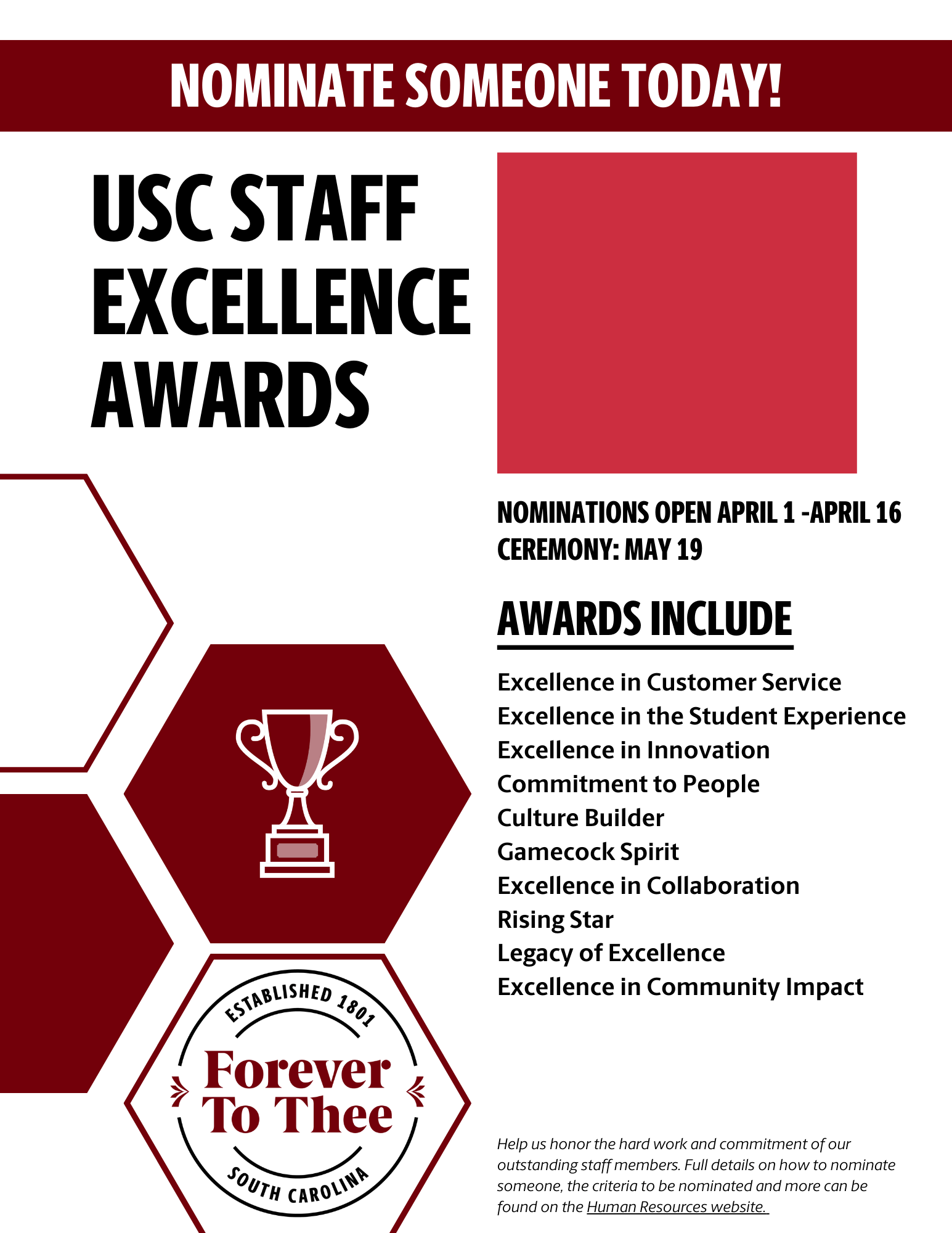 Awards Ceremony: The USC Staff Excellence Awards Ceremony will take place on May 19, where we will celebrate the winners and their remarkable contributions. This event is a wonderful opportunity to come together as a community and recognize the excellence within our staff. Winners will receive a one-time cash prize as a token of appreciation.