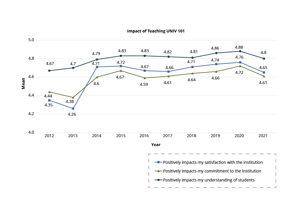 Impact of teaching University 101 on instructors, fall semesters 2012-2021. Data retrieved from University 101 faculty survey and presented on 5-point scale.
