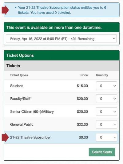 To redeem, simply log in to your account using your user name and password, then select the show date and time you would like to attend. A blue alert bar above the different ticket options will tell you how many tickets you have available to use for that show.  Select the number of tickets you would like to reserve next to the ticket type listed as Theatre Subscriber or Dance Subscriber, then proceed with the normal checkout process.  See below for an example.