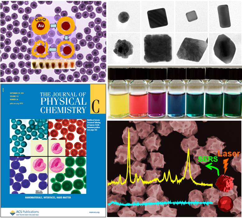 Nanophotonic materials have emerged as an important class of subwavelength optical components that interact with light in unique ways on the nanometer length-scale. Our interests in nanophotonic materials broadly span several important aspects in this field, including but not limited to nanostructure fabrication, nanoscale self-assembly, structure-property relationship, and applications of these materials. We have been working on several nanostructures with geometrically tunable optical properties, such as semiconductor nanoshells, metal-semiconductor core-shell heteronanostructures, and complex metallic nanoparticles. We are particularly interested in (i) development of new approaches for the controllable fabrication of optically active nanostructures; (ii) utilization of optically active nanostructures as building blocks to assemble mesoscopic structures over multiple length scales; (iii) detailed characterization of the optical properties of these nanomaterials both at the ensemble and single-nanoparticle levels; (iv) development of quantitative understanding on the structure-property relationship of these nanostructures through combined experimental and theoretical efforts; and (v) applications of these nanophotonic materials in surface-enhanced spectroscopies for ultrasensitive molecular sensing.