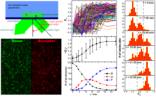 Our group has been working on the development of detailed, molecular-level understanding of important nucleic acid (NA) structural remodeling processes chaperoned by retroviral nucleocapsid (NC) proteins. Rretroviral NC proteins promote several NA structural remodeling processes that are crucial to the retroviral life-cycles, such as the obligatory strand transfers in the reverse transcription, the maintenance and integration of proviral DNA, and the genomic RNA protection and packaging. NC-chaperoned NA structural remodeling typically involves various intermediates along multiple reaction pathways and is tightly associated with heterogeneous conformational dynamics over multiple time-scales that cannot be synchronized and resolved by ensemble measurements. Single-molecule spectroscopy provides an extremely powerful way to characterize such complex biomolecular processes without the ensemble averaging effects. Our group uses time-resolved single-molecule spectroscopy as an analytical tool to study the kinetics and mechanism of NC-chaperoned NA annealing that occurs during the reverse transcription and to resolve the conformational dynamics associated with NC-induced local bending of proviral DNA. These single-molecule measurements allow us to gain molecular-level insights on the complicated, dynamic NC-NA interactions that underpin NCs’ NA chaperone functions.