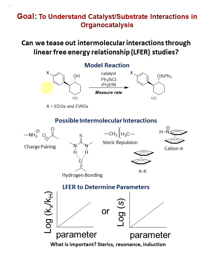 The Wiskur research group is interested in the fundamentals of how reactions work, from what forces drive intermolecular interactions between substrates and catalysts to how microenvironments around reaction sites affect reaction outcomes. We are physical organic chemists applying our knowledge to the world of asymmetric chemistry. We work in the area of organocatalysis, and the intermolecular interactions that drive selectivity within these systems. Techniques such as kinetics and linear free energy relationships help us to tease out the important interactions that affect these reactions so that these interactions can be purposefully introduced in future systems. Ultimately, understanding the details of what drives reaction rates and selectivity will aid chemists in future reaction and catalyst development.